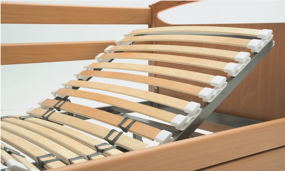 • Somier: tubo de acero 30×20 mm con 24 láminas de haya natural sobre tacos de caucho basculantes.